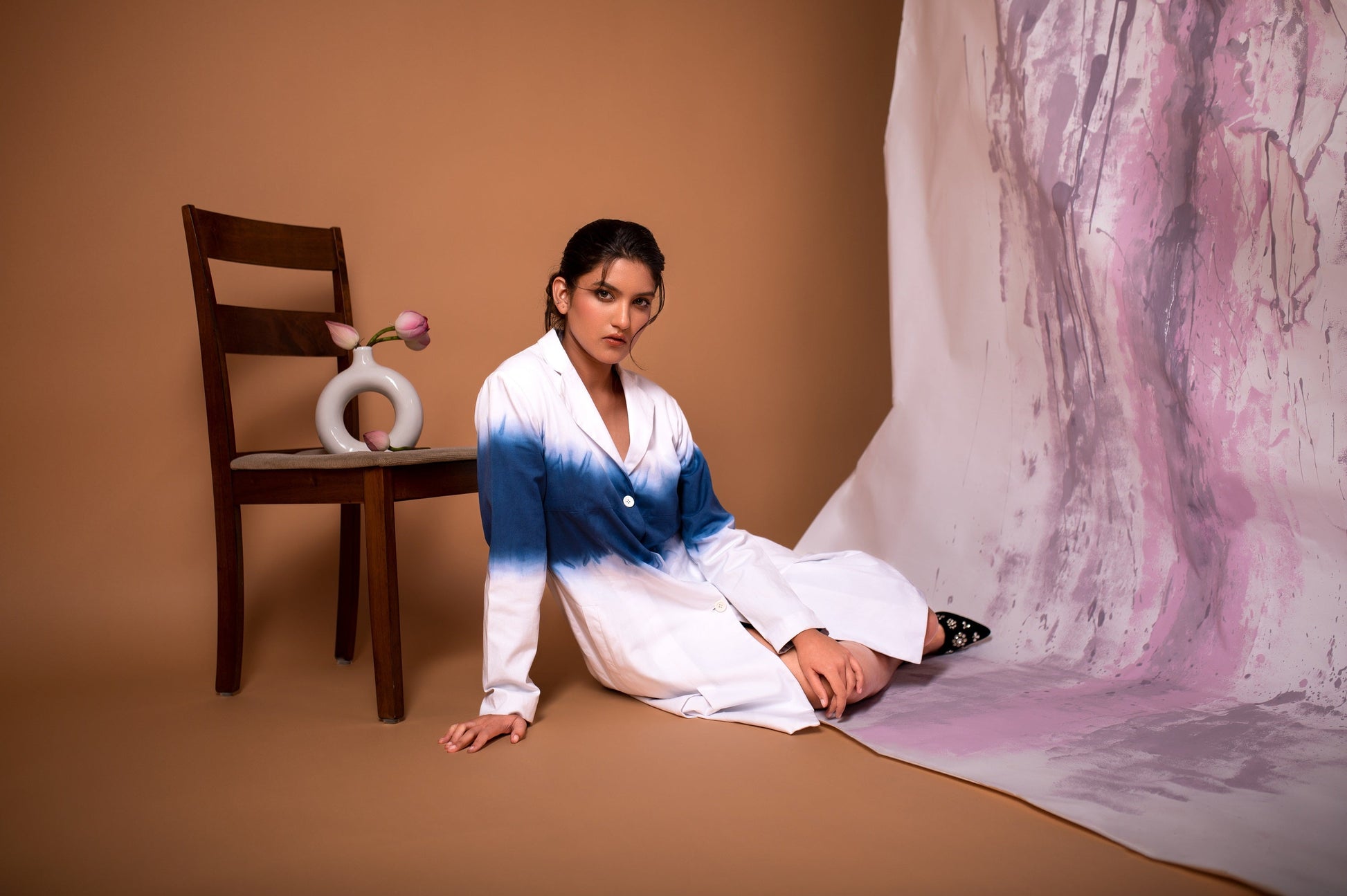 A knee length jacket, made out of organic oxford cotton, ombre dyed, lightly pleated with a peaked lapel collar and full sleeves.